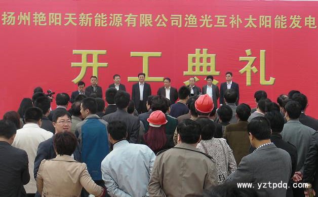 2014年4月18日,揚(yáng)州艷陽(yáng)天新能源有限公司漁光互補(bǔ)太陽(yáng)能發(fā)電項(xiàng)目開(kāi)工奠基儀式在寶應(yīng)縣柳堡仁里蕩隆重舉行。寶應(yīng)縣相關(guān)領(lǐng)導(dǎo)、上海新能源行業(yè)協(xié)會(huì)會(huì)長(zhǎng)朱元昊、揚(yáng)州艷陽(yáng)天新能源有限公司負(fù)責(zé)人、柳堡各村(居)支部書(shū)記、各部門(mén)單位負(fù)責(zé)人、柳堡鎮(zhèn)機(jī)關(guān)全體干部等參加了開(kāi)工奠基儀式。