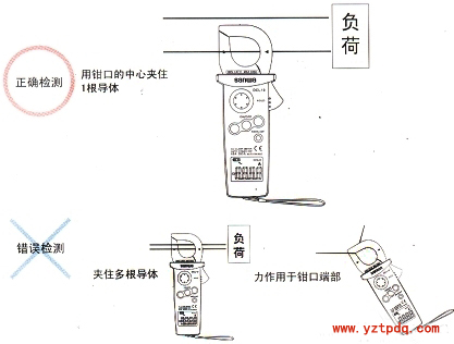 ?、郯聪掳鈾C(jī)打開鉗口,鉗住一根導(dǎo)線,如果鉗住兩根以上,測量無效。