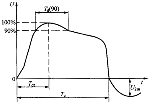 (1)波形及試驗電壓。波形如圖4-3所示。其中波頭時間(Tcr)應(yīng)≥1OOμS;波尾(TZ)時間應(yīng)≥1000μS;超過90%規(guī)定峰值持續(xù)時間(Td(90))應(yīng)≥200μS,反峰電壓值(U2m)不大于試驗電壓的50%(試驗電壓值可參見預(yù)規(guī)的表6)。