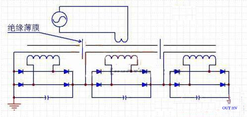 這種方式的電路示意圖如圖3所示。特點是,磁芯是由多段組合而成,每段磁芯之間都用絕緣性能很好的薄膜進行絕緣。每段磁芯都有一個次級繞組。優(yōu)點是:適合較大功率的輸出。變壓器數(shù)量少,只需要一副磁芯。每段次級繞組與磁芯的電壓差小,次級繞組對磁芯的絕緣容易處理。缺點是:磁芯是分段的,結構復雜。磁芯有氣隙,分段越多,等效氣隙越大,磁芯固定困難。