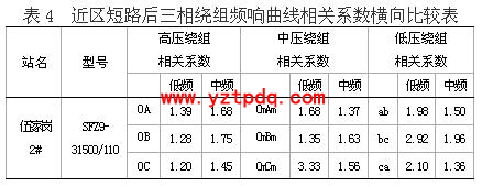 3) 在用頻率響應(yīng)法判斷繞組是否存在變形時,以頻響曲線與歷史曲線縱向比較為主要依據(jù),相關(guān)系數(shù)好(波峰和波波谷無位移)說明繞組未變形,如果相關(guān)系數(shù)不好,必須輔以阻抗電壓法加以驗證,并參考三相繞組頻響曲線進(jìn)行橫向比較。在阻抗電壓變化高于4%時,表明變壓器繞組已發(fā)生嚴(yán)重變形,應(yīng)該立即退出運(yùn)行;阻抗電壓變化高于2%時應(yīng)引起足夠的重視。