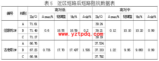 3) 2004年12月8日,雨天,10KV黃磷二回古21開關(guān)因線路接地,產(chǎn)生過電壓,導(dǎo)致10KV母線短路,古老背2#主變差動速斷動作,2#主變?nèi)齻?cè)開關(guān)跳閘。當(dāng)天我們進(jìn)行了繞組變形試驗,通過與歷史曲線對比,我們發(fā)現(xiàn)中低壓側(cè)頻響曲線一致性相當(dāng)好,但高壓繞組A相高頻段相關(guān)系數(shù)為1.33,分析頻響圖譜發(fā)現(xiàn)相關(guān)系數(shù)不好的原因不是波峰波谷的變化,而是A相繞組在2K頻率下幅值比歷史曲線低。短路阻抗測試結(jié)果顯示高壓對低壓三相繞組電抗值相差僅0.736%,高壓對低壓繞組短路阻抗與銘牌值相比,相差1.506%,高壓對中壓短路阻抗值與銘牌值相差0.99%,見表5。直流電阻測量也顯示無匝間或?qū)娱g短路。該變壓器原為無載調(diào)壓變壓器,在城網(wǎng)改造中進(jìn)行過無載改有載改造,將高壓中性點解開,拆分為X、Y、Z后外加三只套管引出,通過三根跳線引至調(diào)壓變壓器。試驗時因雨未將架空線與X、Y、Z三只套管解開,而是直接將架空線與調(diào)壓變的聯(lián)結(jié)解開,這樣A 相繞組尾端末懸空并連有約2m長的跳線。2K頻率下繞組響應(yīng)幅值比歷史曲線下降的原因在于引線未拆除。 引線感應(yīng)電壓的影響(1#主變?nèi)栽谶\(yùn)行,相距約4米)、引線與高壓A相套管的接觸不良均會造成此現(xiàn)象發(fā)生。因此我們下出高壓繞組A相無變形的結(jié)論,目前該變壓器一直安全運(yùn)行。