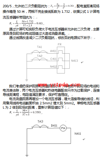最好的解決辦法是不增大電纜截面積的情況下,應該優(yōu)先選用200/1的電流互感器,同樣5VA的容量下允許的二次負荷為5Ω,原來的2.5mm2電纜足夠滿足要求,不會增加很多成本,同時滿足更遠距離的測量要求。