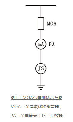 金屬氧化物避雷器目前廣泛采用一體化結構即制造廠家在計數(shù)器前邊串一只全電流mA表,在運行電壓下測量全電流值,根據(jù)此電流值大小,判斷MOA的運行狀態(tài)。接線圖如圖1-1所示。