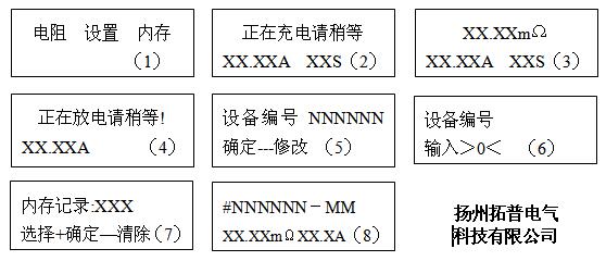 儀器開(kāi)機(jī)或按復(fù)位鍵后,進(jìn)入初始狀態(tài)(1)。此時(shí)光標(biāo)指針指向“電阻”,直接按“確定”鍵進(jìn)入狀態(tài)(2),顯示變化的充電電流和測(cè)量時(shí)間,充電完成后自動(dòng)進(jìn)入狀態(tài)(3),顯示電阻值、測(cè)量電流和測(cè)量時(shí)間,此時(shí)每一次“確定” 鍵則儲(chǔ)存一次測(cè)量結(jié)果(帶打印機(jī)的機(jī)型同時(shí)打印出測(cè)量結(jié)果)。按“復(fù)位”鍵退出電阻測(cè)量,進(jìn)入狀態(tài)(4),顯示放電電流。放電結(jié)束后,自動(dòng)回到初始狀態(tài)(1),完成一次電阻測(cè)量。