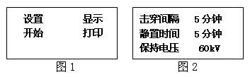 當(dāng)設(shè)定的實(shí)驗(yàn)完成后,顯示器將返回顯示菜單此時(shí),選擇到“顯示”選項(xiàng)按“確認(rèn)”鍵,顯示器可顯示每次擊穿值和平均值。并回到菜單下。 在菜單下,選擇到“打印”選項(xiàng)按“確認(rèn)”鍵,打印機(jī)將打印一次所有實(shí)驗(yàn)結(jié)果然后自動(dòng)返回菜單。