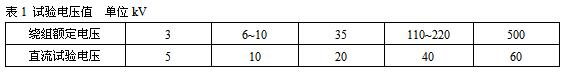 記錄頂層油溫及環(huán)境溫度和濕度。確認(rèn)一切正常后開始試驗(yàn)。先空載分段加壓至試驗(yàn)電壓,以檢查試驗(yàn)設(shè)備絕緣是否良好、接線是否正確。將直流電源輸出加在被試變壓器繞組上,測(cè)量時(shí),加壓到0.5倍試驗(yàn)電壓,待1min后讀取泄漏電流值。然后加壓到試驗(yàn)電壓,待1min后讀取泄漏電流值。被測(cè)繞組試驗(yàn)完畢,將電壓降為零,切斷電源,必須充分放電后再進(jìn)行其他操作。試驗(yàn)結(jié)果判斷依據(jù)試驗(yàn)電壓見表1。