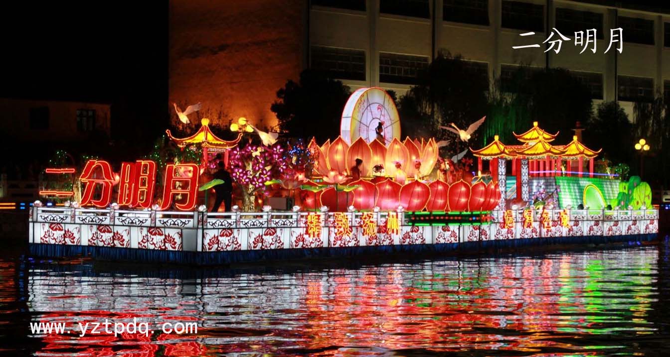 由蜀岡—瘦西湖風(fēng)景名勝區(qū)制作的領(lǐng)航花船“二分明月”號(hào)。該花船以國(guó)家5A級(jí)風(fēng)景區(qū)蜀崗—瘦西湖為藍(lán)本建構(gòu)。風(fēng)姿卓越獨(dú)樹一幟的五亭橋,寓意著幸福年年,代表著人類的智慧與巧思?;始艺洳匾撇綋Q景的白塔,見證著鹽運(yùn)的發(fā)達(dá),代表著至高的榮耀與尊寵。亭臺(tái)軒榭、層巒疊嶂、青山掩翠、桃紅柳綠,好一個(gè)荷塘月色,人間仙境。