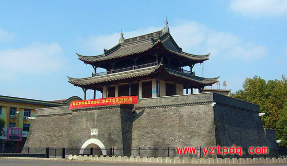 位于市區(qū)城河景觀帶,是儀征較為完整的古城遺址。建于明代成化23年(公元1487年),是儀揚(yáng)歷史上漕運(yùn)的交通要沖。樓體建在有拱門的通道的高臺(tái)基之上,面闊三間,兩層,層面鋪簡瓦,為帶徊廊的重檐九脊歇山頂式結(jié)構(gòu)建筑。有碑記兩方,一方為嘉靖甲申年間(公元1542年)記載鼓樓被辟為關(guān)王祀祠的情況;一方為嘉靖44年間(公元1565年)記載倭寇侵犯我東南沿海的史實(shí)。樓南有“小秦淮”之稱的儀城河,登樓四望,城市風(fēng)貌盡收眼底。
