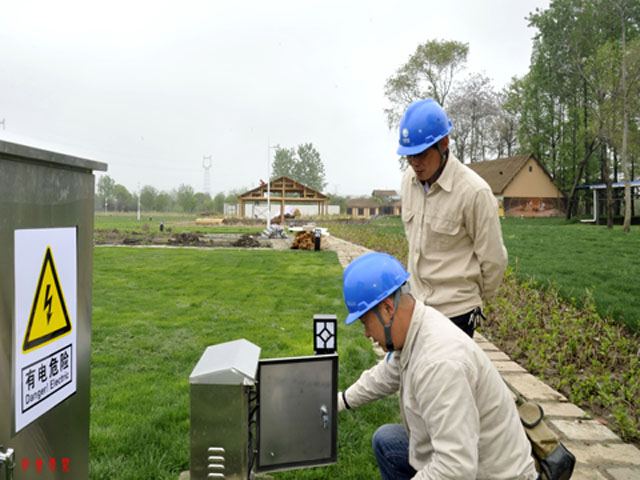 2019年4月26日,江蘇高郵市供電公司龍虬供電所員工在位于龍虬鎮(zhèn)北側(cè)的龍虬莊遺址公園檢查路燈控制箱。“五一”將至,擴(kuò)建的龍虬莊遺址公園將于4月28日開門迎客,高郵市供電公司組織人員前往公園開展用電檢查,確保節(jié)日期間公園內(nèi)安全可靠用電。