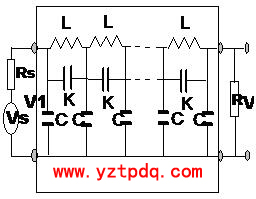 圖中:L、K及C分別代表繞組單位長度的分布電感、分布電容及對地分布電容,V1、V2分別為等效網(wǎng)絡(luò)的激勵端電壓和響應(yīng)端電壓,Vs為正弦波激勵信號源電壓,Rs為信號源輸出阻抗,R為匹配電阻。