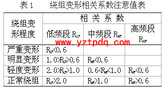 相關(guān)系數(shù)是表明兩條曲線波峰或波谷分布位置及分布數(shù)量變化的量化參數(shù),直觀地描述了頻響曲線之間的相似程度。數(shù)值越大表明兩條曲線重合度越好,越小表明重合度越差,它是判斷繞組是否變形的主要數(shù)值判據(jù)。變壓器繞組變形測試儀對相關(guān)系數(shù)的規(guī)定見表1,在實際應(yīng)用中我們發(fā)現(xiàn)其高頻段相關(guān)系數(shù)受外界影響較大,高頻段相關(guān)系數(shù)僅供參考。