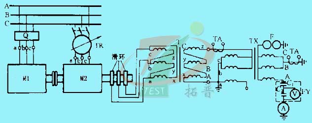 其同步發(fā)電機(jī)組基本原理接線如上圖所示。圖中,電源裝置同補(bǔ)償電抗器、中間升壓變壓器以及必要的外圍測量設(shè)備聯(lián)合使用。電源主要由三相異步電動機(jī)和無刷勵(lì)磁的中頻同步發(fā)電機(jī)組成中頻發(fā)電機(jī)組,再配以啟動、控制、測量和保護(hù)系統(tǒng)組成。其工作原理為中頻發(fā)電機(jī)發(fā)出定頻率(150Hz)的單相或三相交流電能,經(jīng)中間變壓器升壓,同時(shí)用補(bǔ)償電抗器來調(diào)整補(bǔ)償被試變壓器的電容性電流,以獲得所需的試驗(yàn)電壓。這種工作原理和方式可以得到所需頻率的試驗(yàn)電壓,電網(wǎng)電源僅用來驅(qū)動發(fā)電機(jī)組和提供直流勵(lì)磁電源,使試驗(yàn)電源與電網(wǎng)電源實(shí)現(xiàn)隔離,從而消除了試驗(yàn)回路來自電網(wǎng)系統(tǒng)的干擾,無刷勵(lì)磁方式也大大降低了電源本身的干擾水平,因此在做感應(yīng)耐壓的同時(shí),也可進(jìn)行局部放電測量。