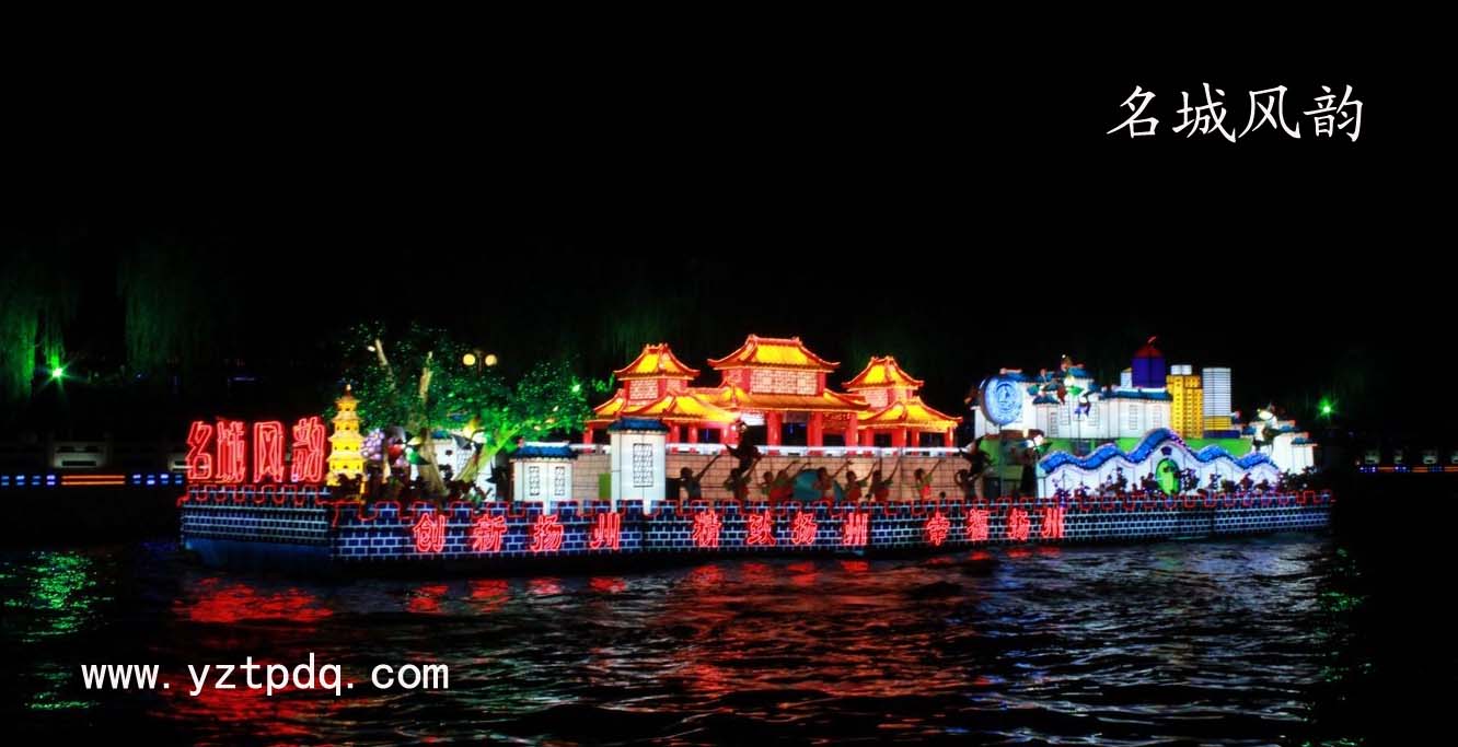 花船以古代城墻、傳統(tǒng)民居等元素體現(xiàn)揚州悠久的歷史文化,以唐代石塔、千年銀杏凸顯揚州的古城風(fēng)韻,展示揚州古城保護成就。以新建的“通江門橋”及高樓林立展示絢爛多彩的“城市之光”,寓意歷史傳承與現(xiàn)代文明的有機統(tǒng)一,展示當(dāng)代揚州人為建設(shè)古代文化和現(xiàn)代文明交相輝映的歷史名城的科學(xué)實踐。