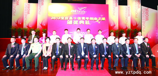 今年,寶應(yīng)縣委、縣政府研究決定開展2012“寶應(yīng)縣十佳青年創(chuàng)業(yè)之星”評選活動。本次活動得到了社會各界的熱烈響應(yīng),經(jīng)過宣傳發(fā)動,推薦申報、確定正式候選人、社會公示等階段,最終評選出10名“十佳青年創(chuàng)業(yè)之星”和10名“十佳青年創(chuàng)業(yè)之星”提名獎。江蘇蓮馨園食品有限公司董事長萬作知、江蘇海創(chuàng)電氣科技有限公司總經(jīng)理王明海、江蘇幻網(wǎng)軟件科技有限公司董事長劉杰、江蘇寶樂實業(yè)有限公司總經(jīng)理楊軍勇、揚州宇新管業(yè)有限公司總經(jīng)理金梅艷、江蘇中恒鋁業(yè)有限公司總經(jīng)理戴玉國、揚州億嘉鐵路材料科技有限公司董事長陳勇、上海景德高級汽車維修有限公司董事長陳道于、揚州沃爾科技有限公司總經(jīng)理楊成、揚州東安管件有限公司董事長謝才紅當選為2012年“寶應(yīng)縣十佳青年創(chuàng)業(yè)之星”。寶應(yīng)縣委書記、縣人大常委會主任仲生在頒獎典禮上發(fā)表了熱情洋溢的講話,代表縣委、縣人大、縣政府、縣政協(xié)向獲得縣“十佳青年創(chuàng)業(yè)之星”的青年企業(yè)家們表示熱烈祝賀,向全縣廣大青年朋友致以節(jié)日的問候。他說,創(chuàng)業(yè)是時代發(fā)展的主題。近年來,全縣廣大青年大力弘揚“三創(chuàng)三先”新時期江蘇精神,以創(chuàng)業(yè)發(fā)展為己任,開拓進取,奮力突破,闖市場、擴銷路,抓創(chuàng)新、搞技改,在創(chuàng)業(yè)、二次創(chuàng)業(yè)道路上勇當排頭兵,展現(xiàn)了青年人的風(fēng)采。