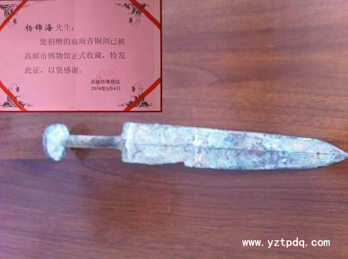 經(jīng)高郵、揚(yáng)州兩地文物考古專家初步鑒定,該劍系商周時(shí)代的青銅古劍。