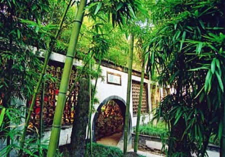 個園是一處典型的私家住宅園林。從住宅進入園林,首先映入眼簾的是月洞形園門。門上石額書寫“個園”二字,“個”者,竹葉之形,主人名“至筠”,“筠”亦借指竹,以為名“個園”,點明主題。園門兩側(cè)各種竹子枝葉扶疏,“月映竹成千個字”,與門額相輝映;白果峰穿插其間,如一根根茁壯的春筍。主人以春景作為游園的開篇,想是有“一年之計在于春”的含意吧!透過春景后的園門和兩旁典雅的一排漏窗,又可瞥見園內(nèi)景色,樓臺、花樹映現(xiàn)其間,引人入勝。進入園門向西拐,是與春景相接的一大片竹林。竹林茂密、幽深,與那幾顆瓊花展現(xiàn)出了生機勃勃的春天景象。